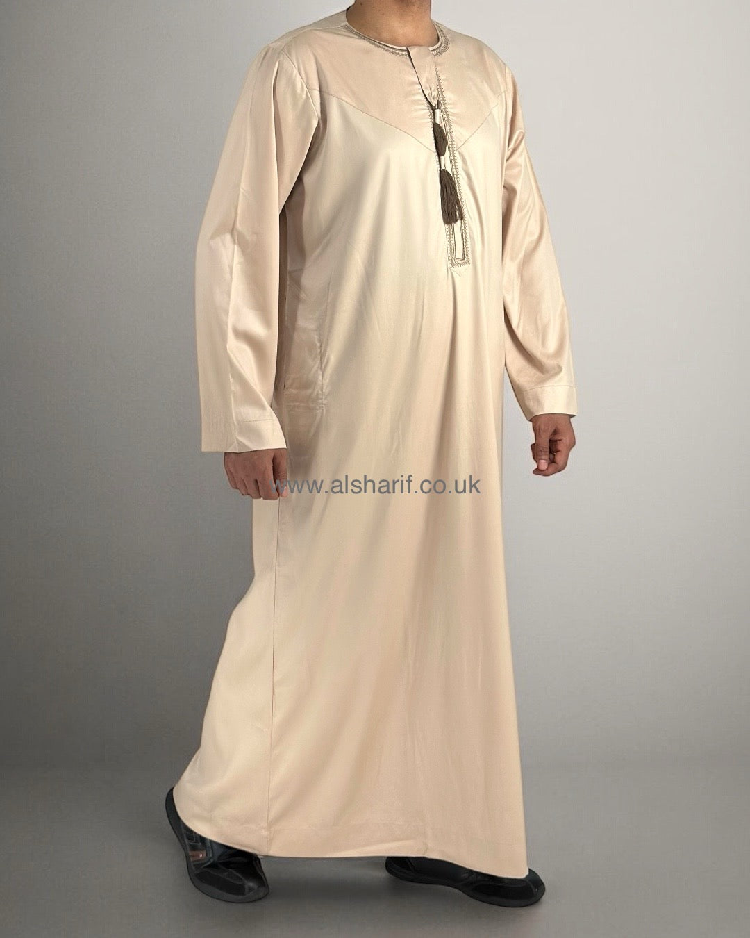 Beige Camel Silky Thobe / Jubba Collarless With Tassel & Zip (Size 58) 17