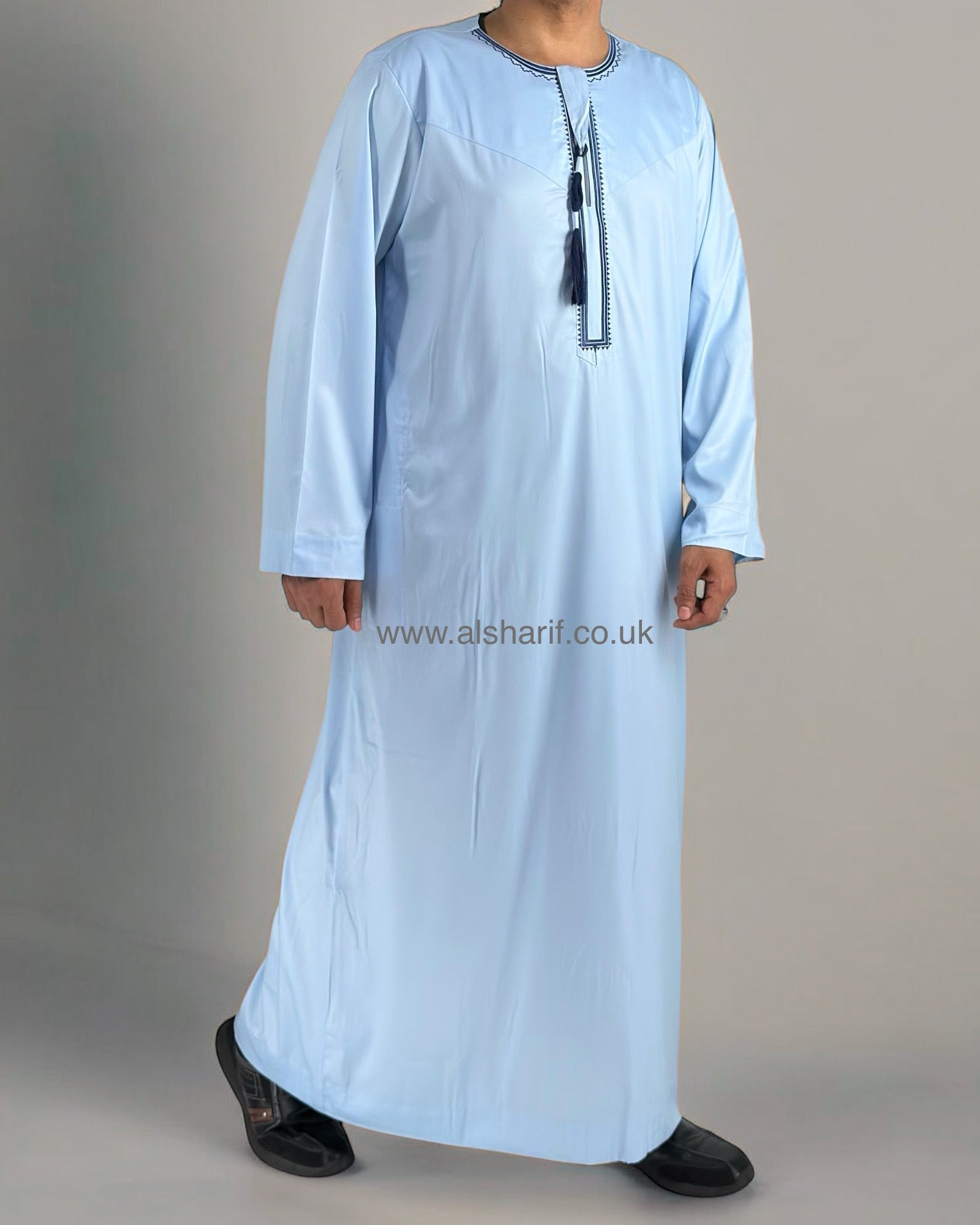 Light Blue Silky Thobe / Jubba Collarless With Tassel & Zip (Size 58) 16
