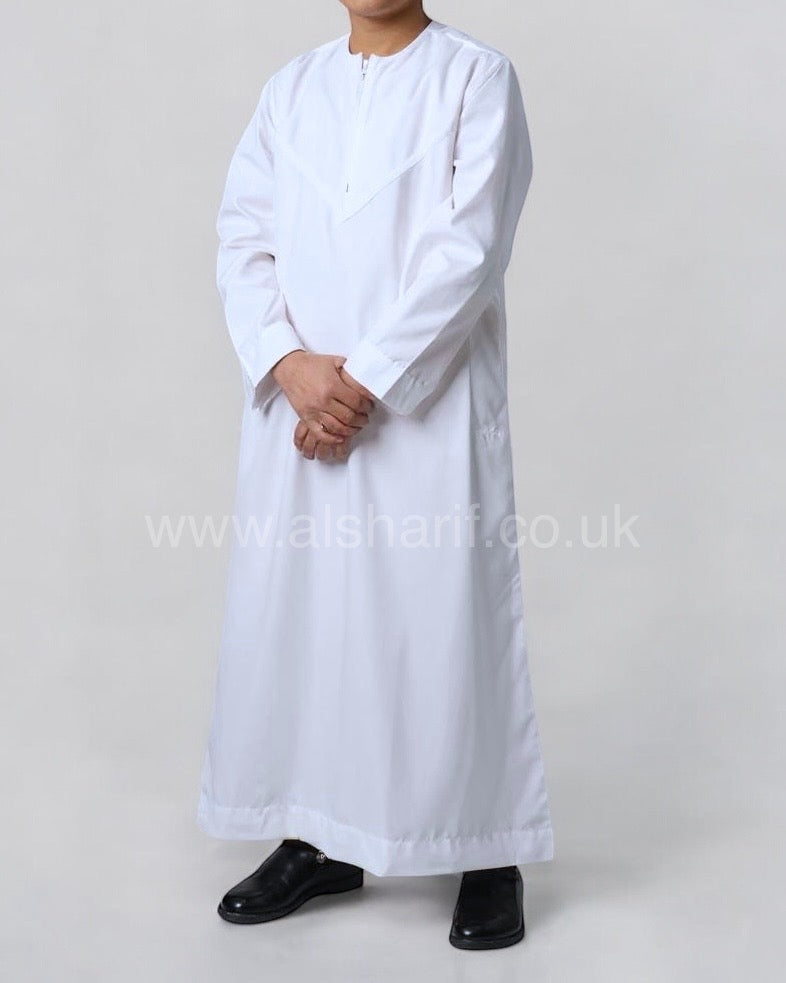 White Silky Boys Thobe Jubba Collarless with Zip (46-1)
