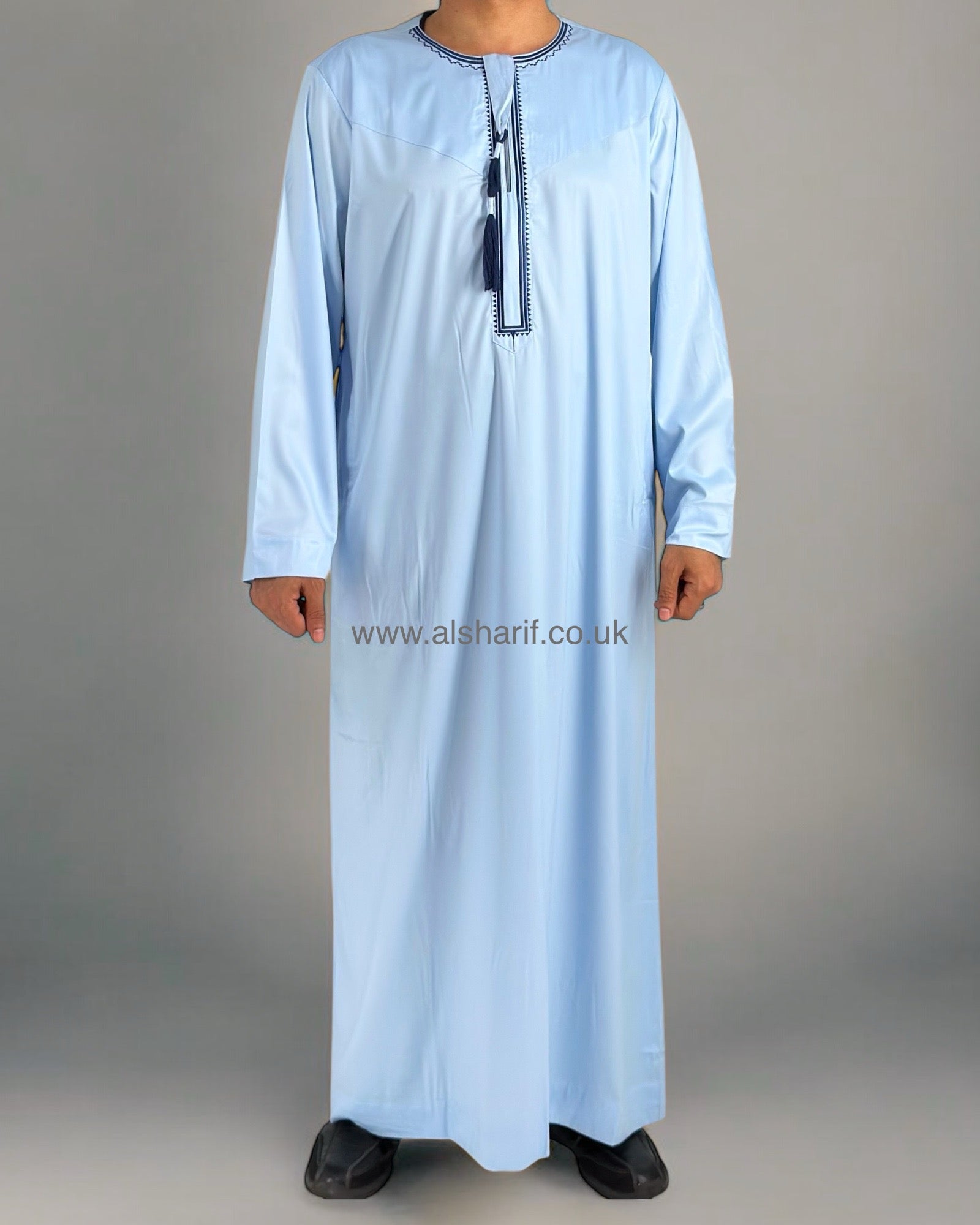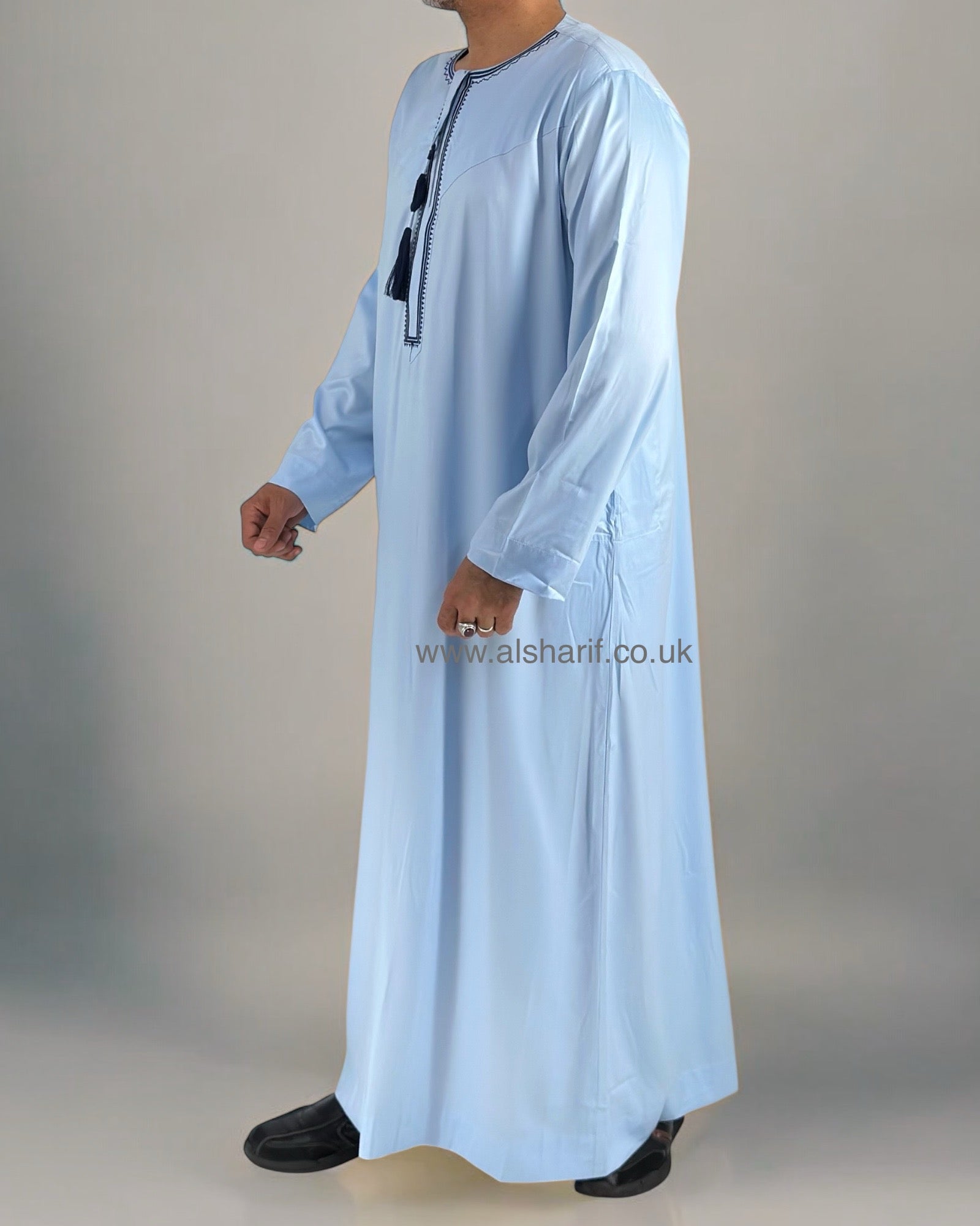 Light Blue Silky Thobe / Jubba Collarless With Tassel & Zip (Size 58) 16