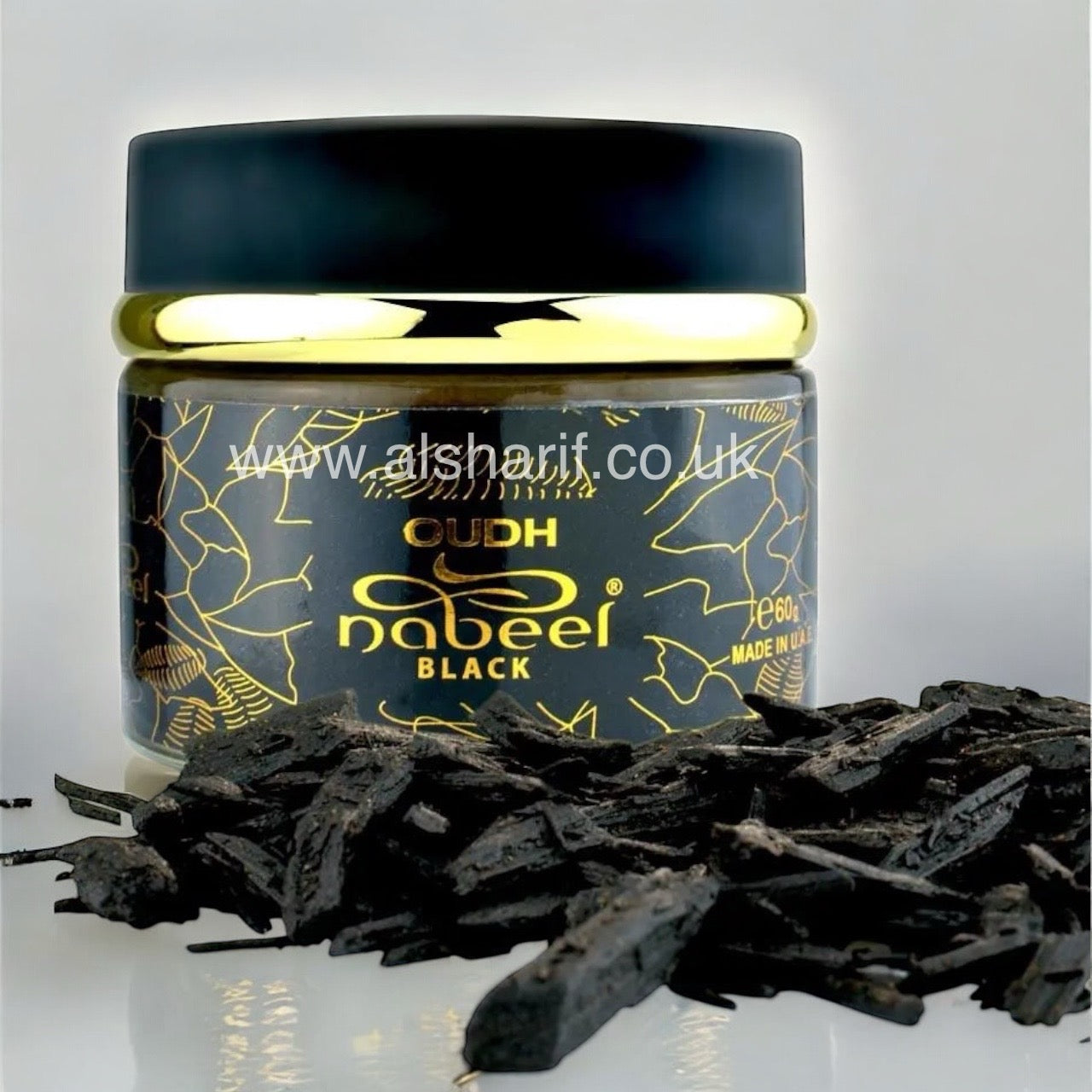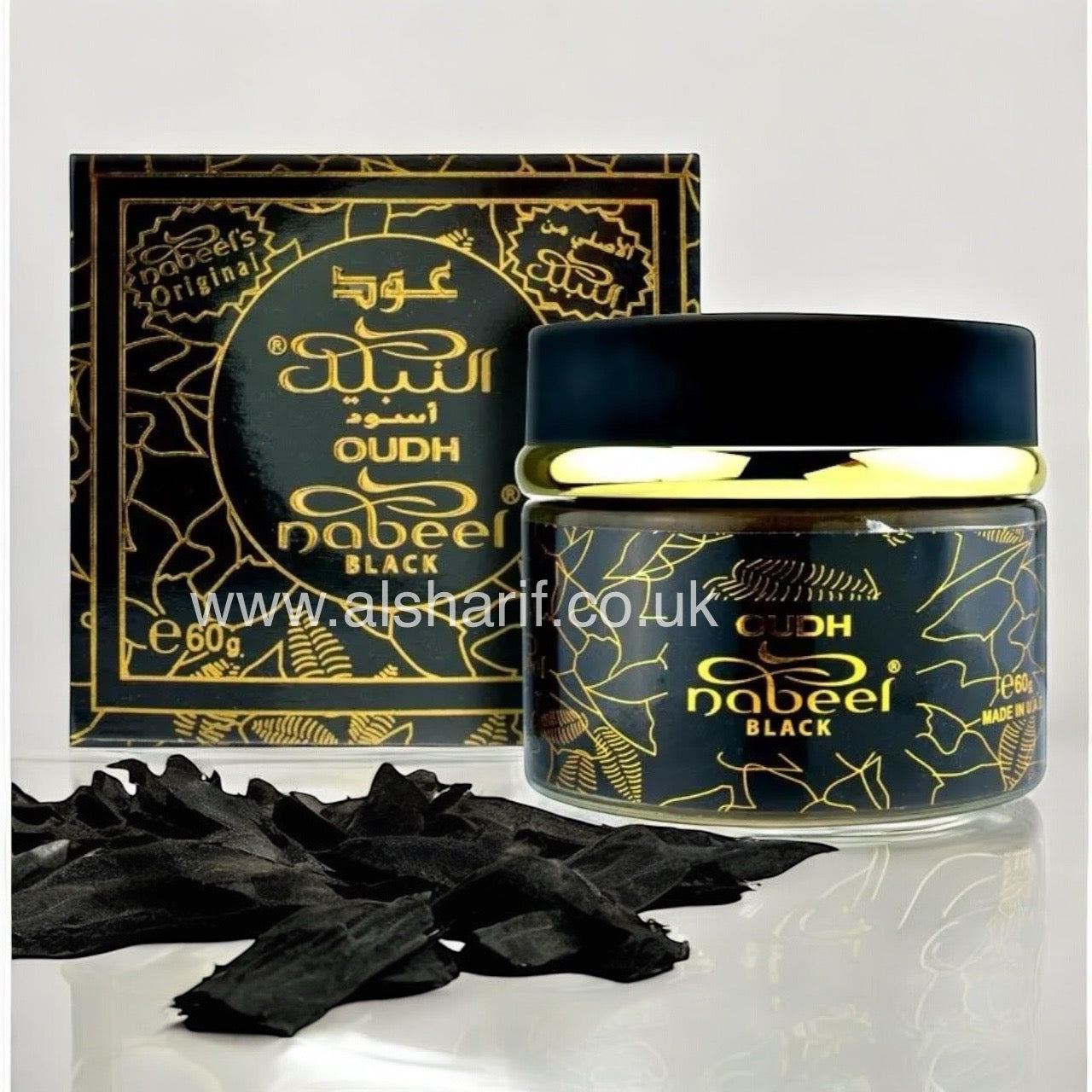 Oudh Nabeel Black 60g is a premium incense blend designed to create a rich and inviting atmosphere. Featuring a unique fusion of citrus, floral, and herbal notes with deep musky and woody undertones, this bakhoor enhances your surroundings with its sophisticated and long-lasting fragrance. Whether used for relaxation or special gatherings, it transforms any space into an oasis of luxury and warmth.