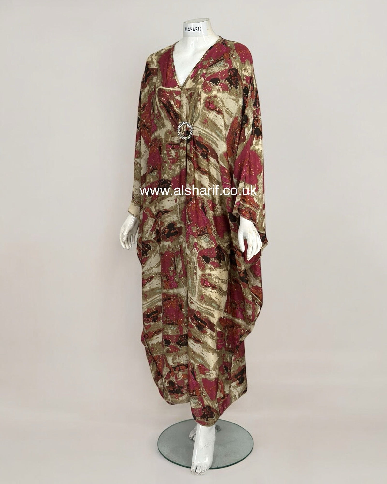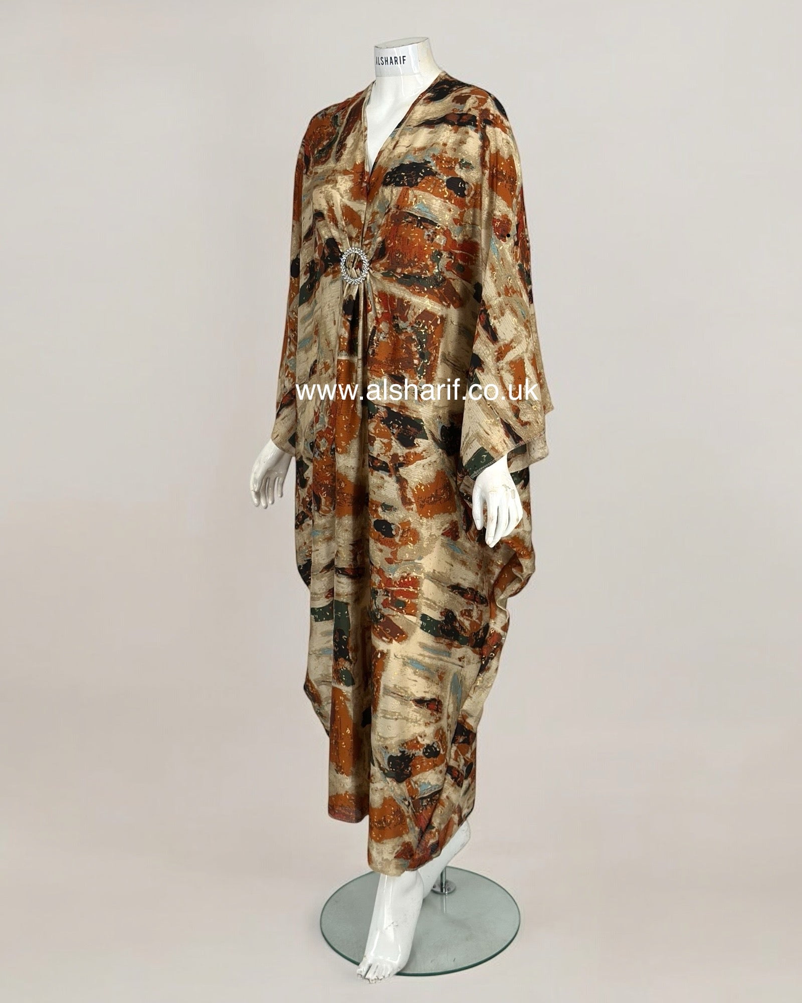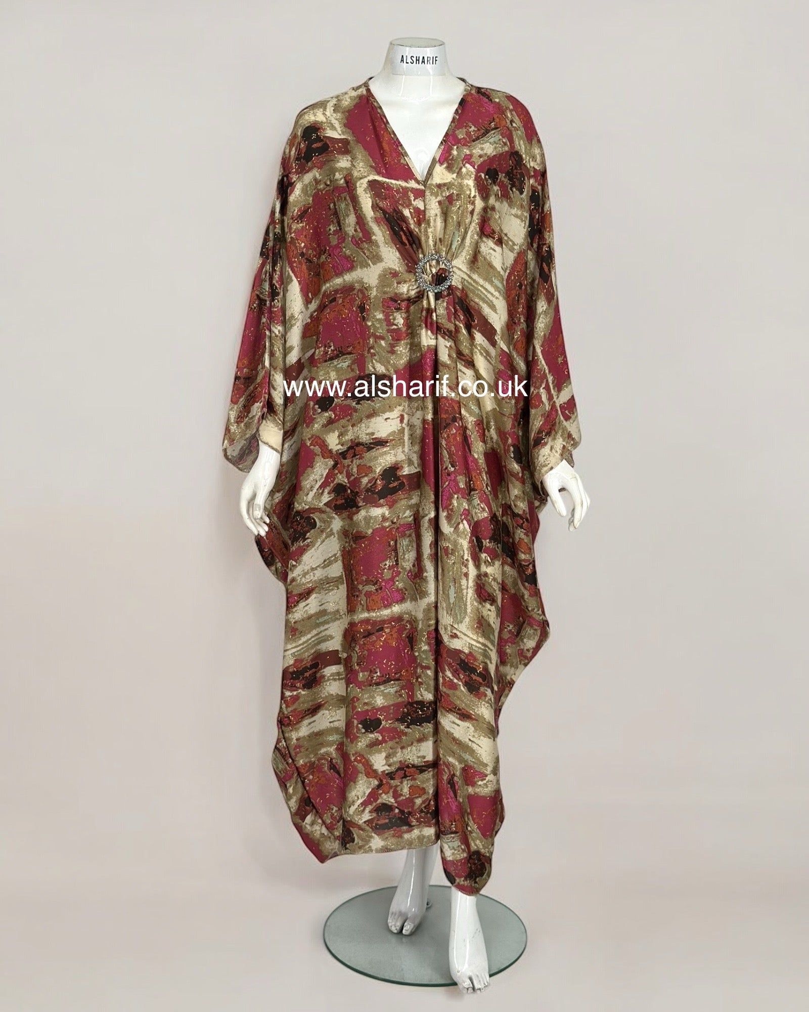 Crafted from high-quality silk-like fabric, the kaftan offers a soft, flowing silhouette that drapes gracefully on all body types. The design is enhanced by a statement brooch at the front, gathering the fabric just below the bust to create a flattering shape and a touch of sophistication.