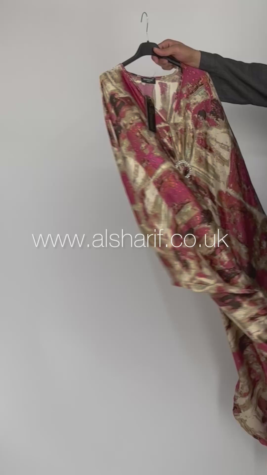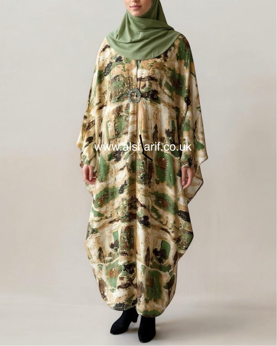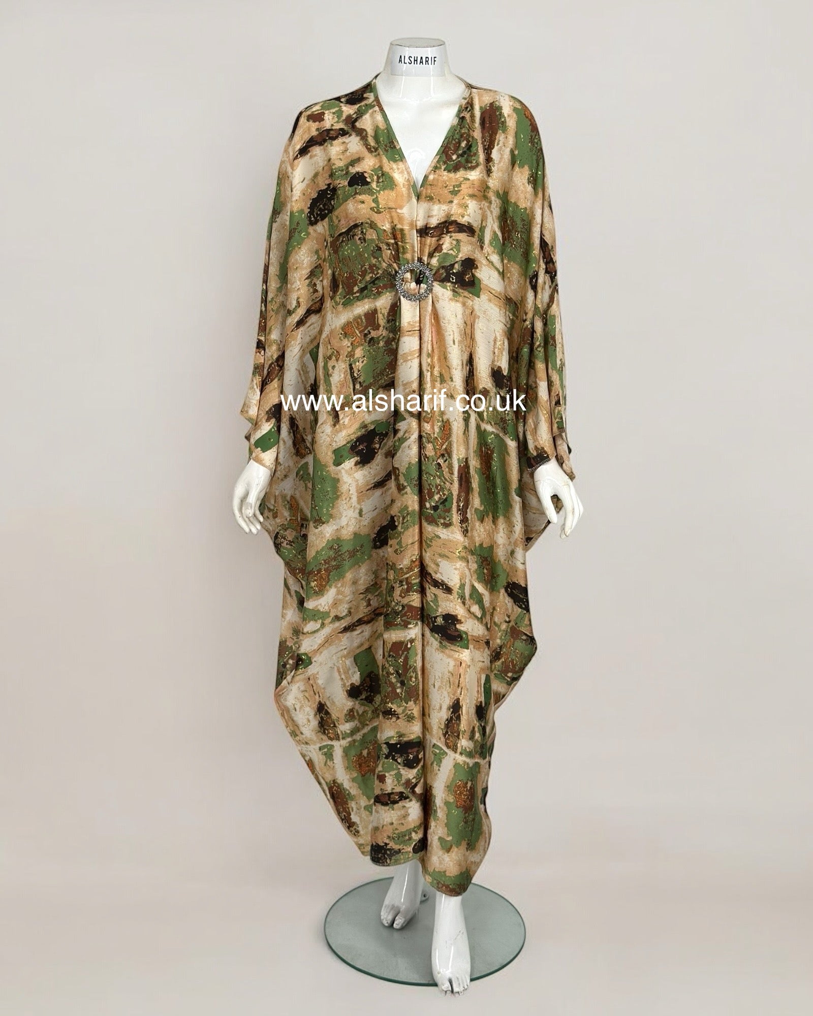 Crafted from high-quality silk-like fabric, the kaftan offers a soft, flowing silhouette that drapes gracefully on all body types. The design is enhanced by a statement brooch at the front, gathering the fabric just below the bust to create a flattering shape and a touch of sophistication.