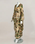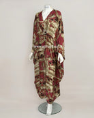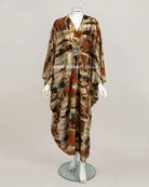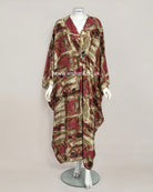 Elevate your wardrobe with this stunning luxury silk kaftan, designed to blend elegance with effortless comfort. Featuring a bold abstract print in rich tones. This piece is accented with delicate metallic gold specks that shimmer beautifully under the light.