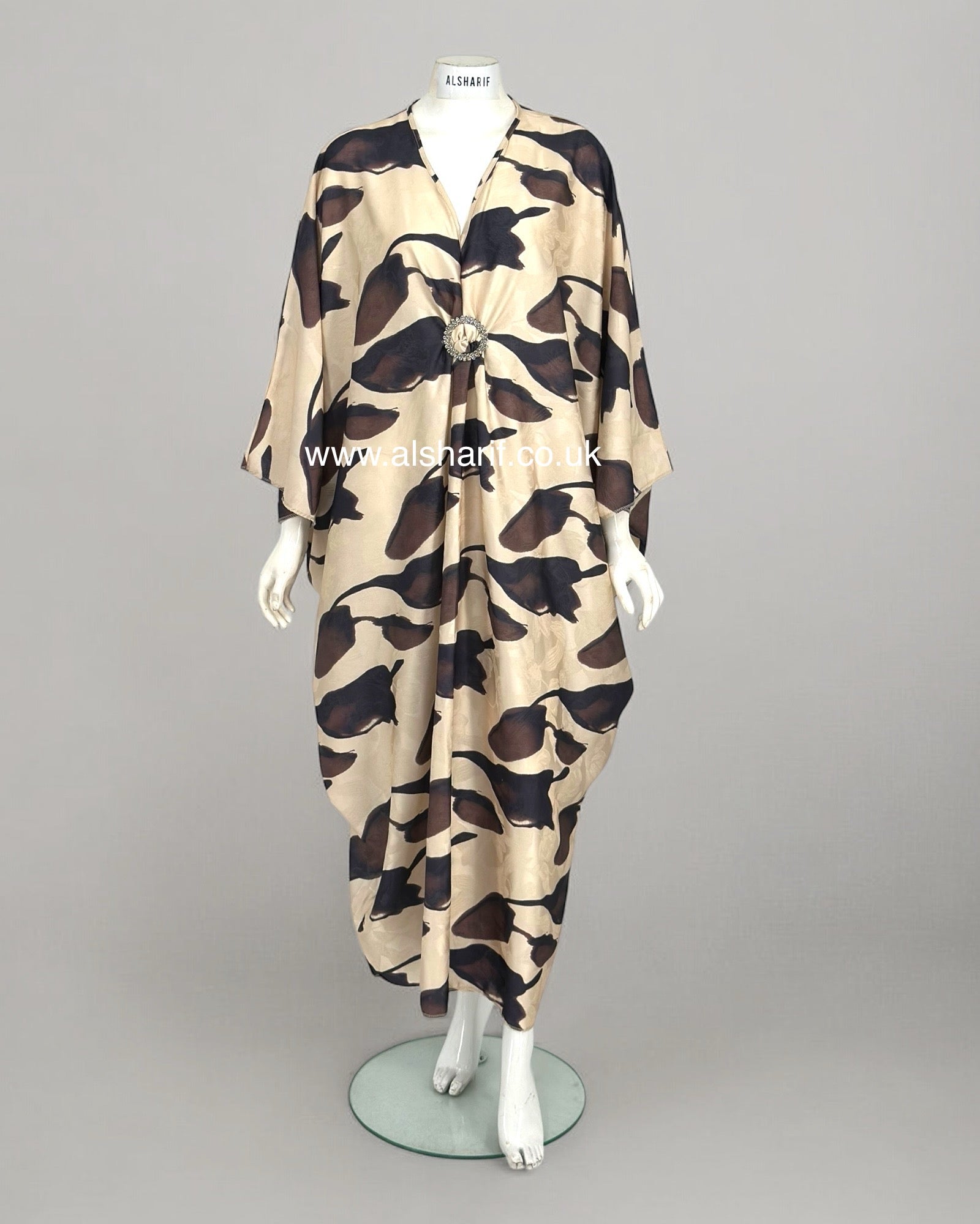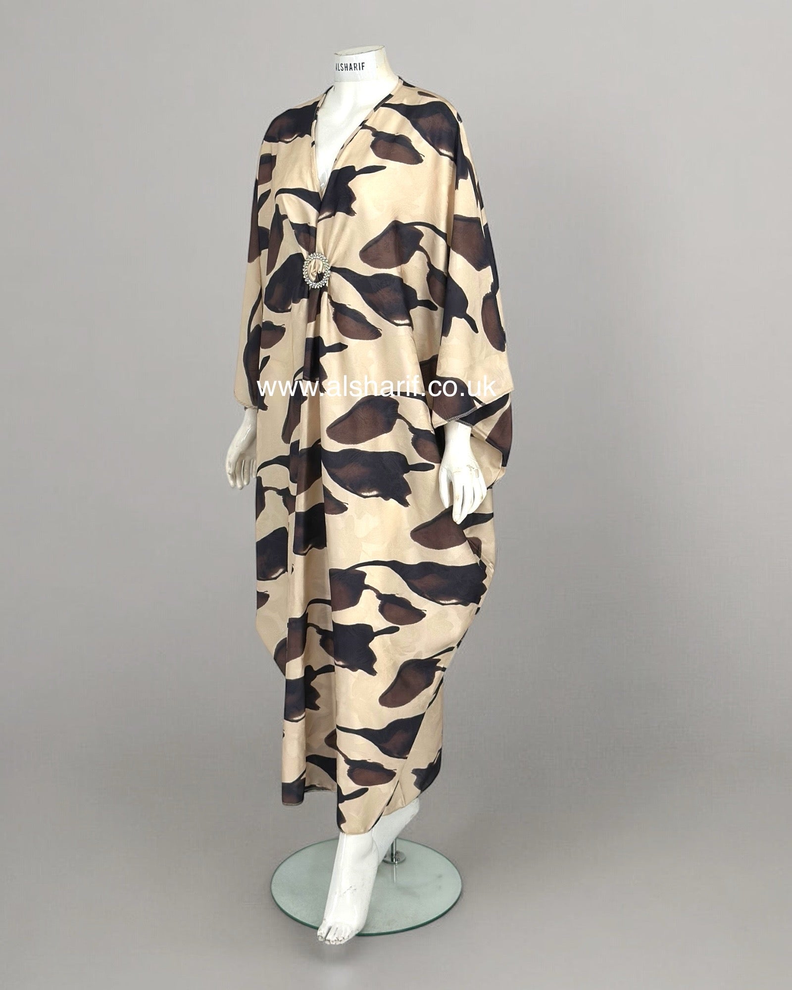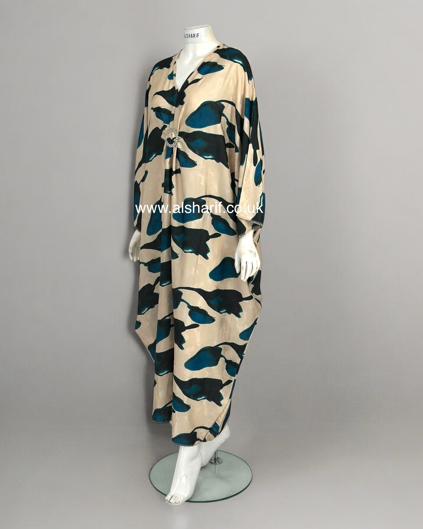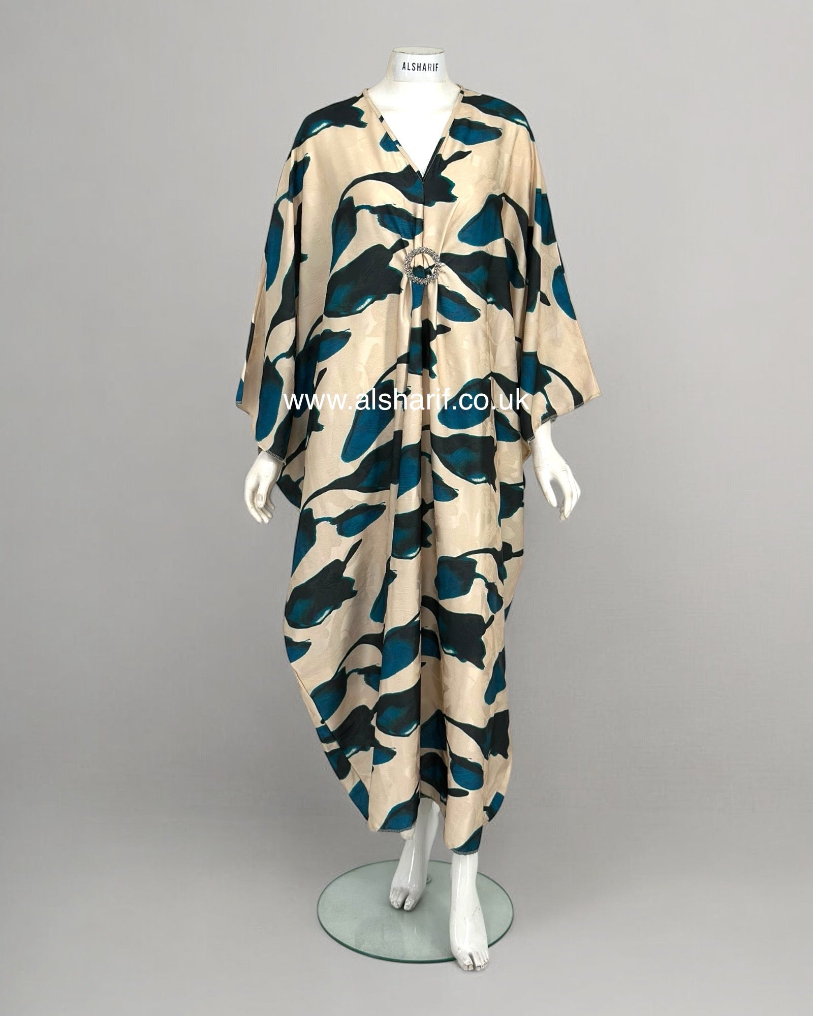 Effortlessly chic and bold, this satin kaftan dress is a true statement piece. Featuring a striking abstract print in deep teal and black on a luxurious cream background, the flowing batwing sleeves add a dramatic silhouette. The look is elevated with a unique brooch detail at the waist, creating a flattering and elegant drape.