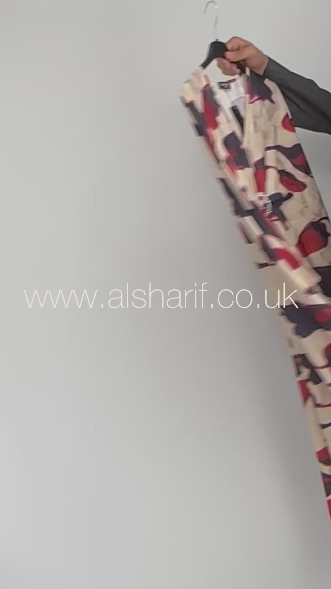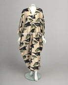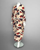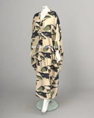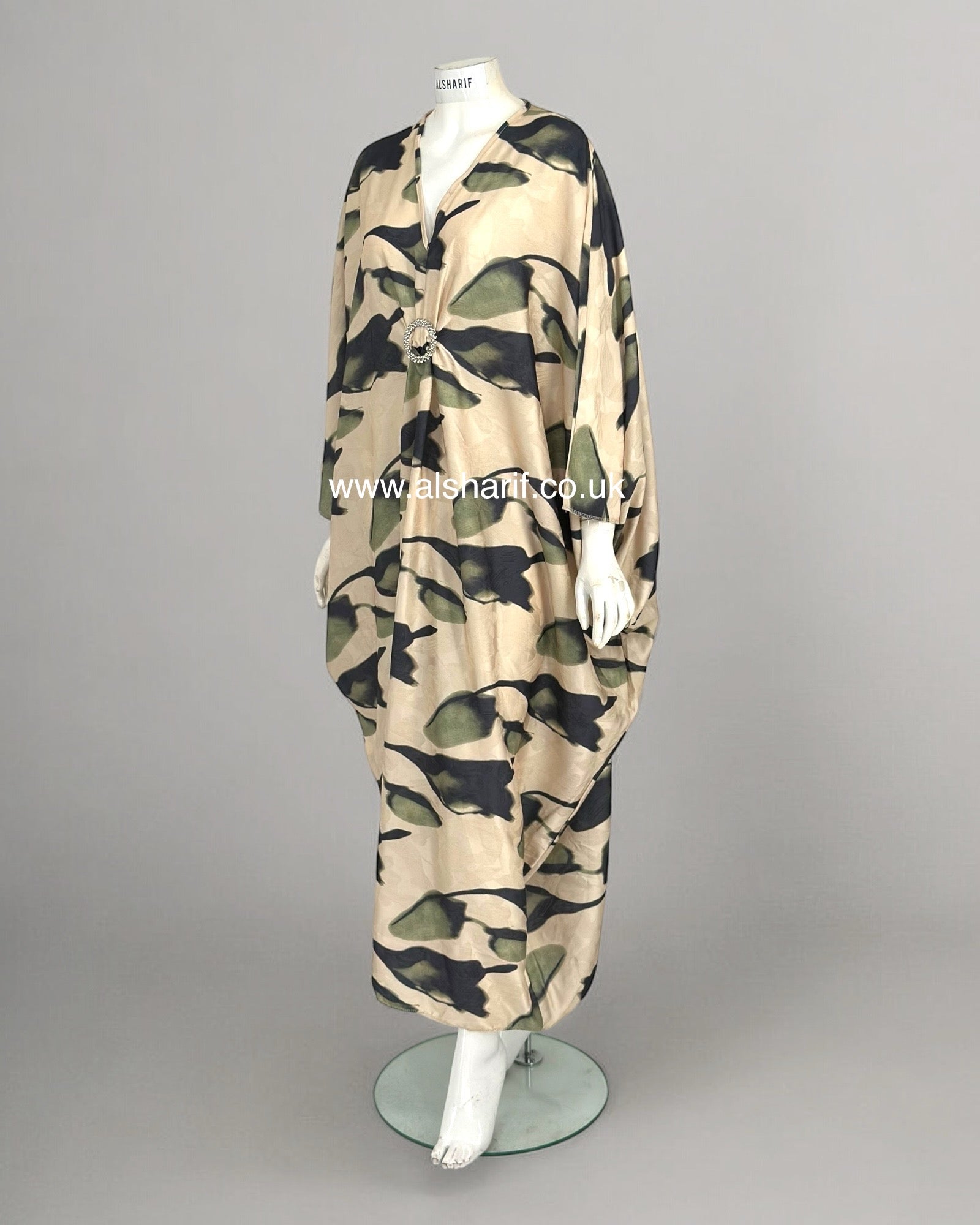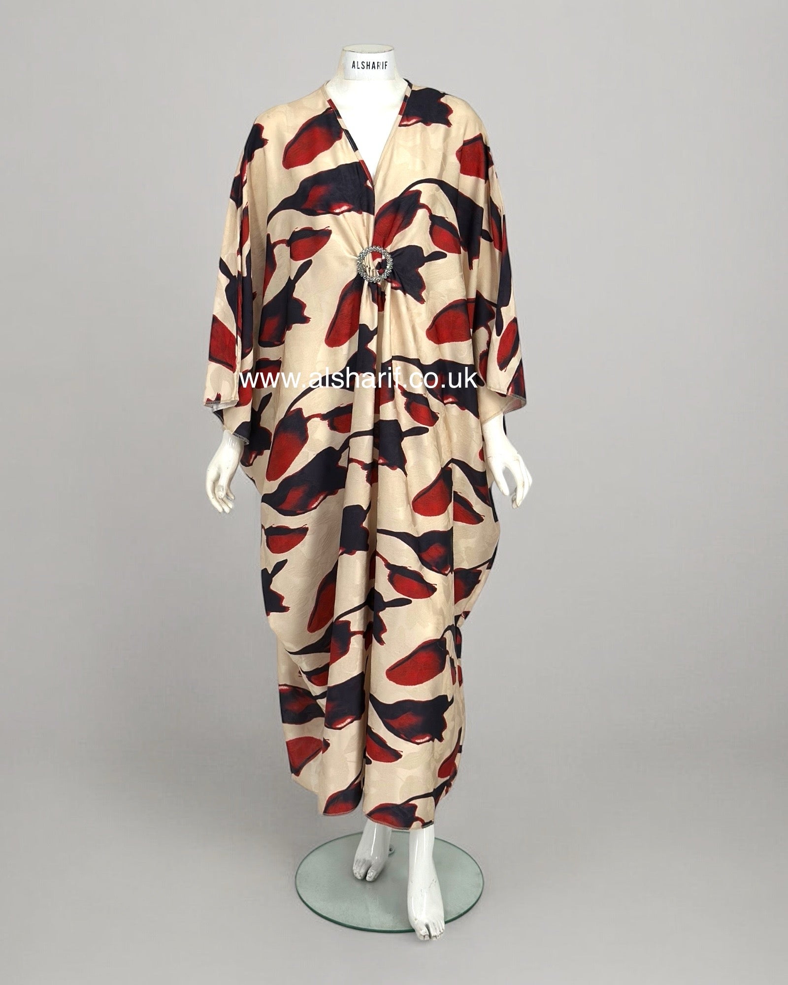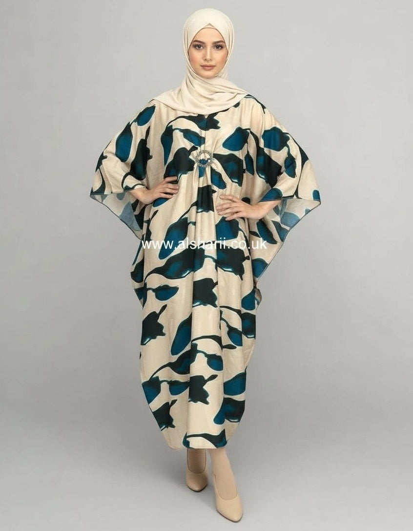 Effortlessly chic and bold, this satin kaftan dress is a true statement piece. Featuring a striking abstract print in deep teal and black on a luxurious cream background, the flowing batwing sleeves add a dramatic silhouette. The look is elevated with a unique brooch detail at the waist, creating a flattering and elegant drape.