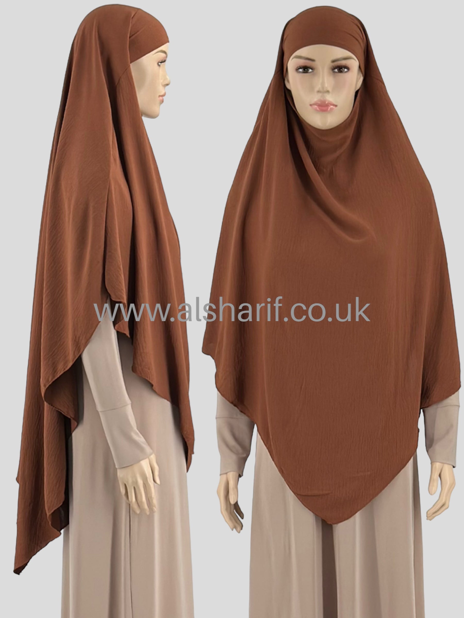 Soft Crepe khimar / hijab with tie backs that can be tied over or under the khimar. Powder touch fabric. It has a very elegant triangle shape at the front and at the back.