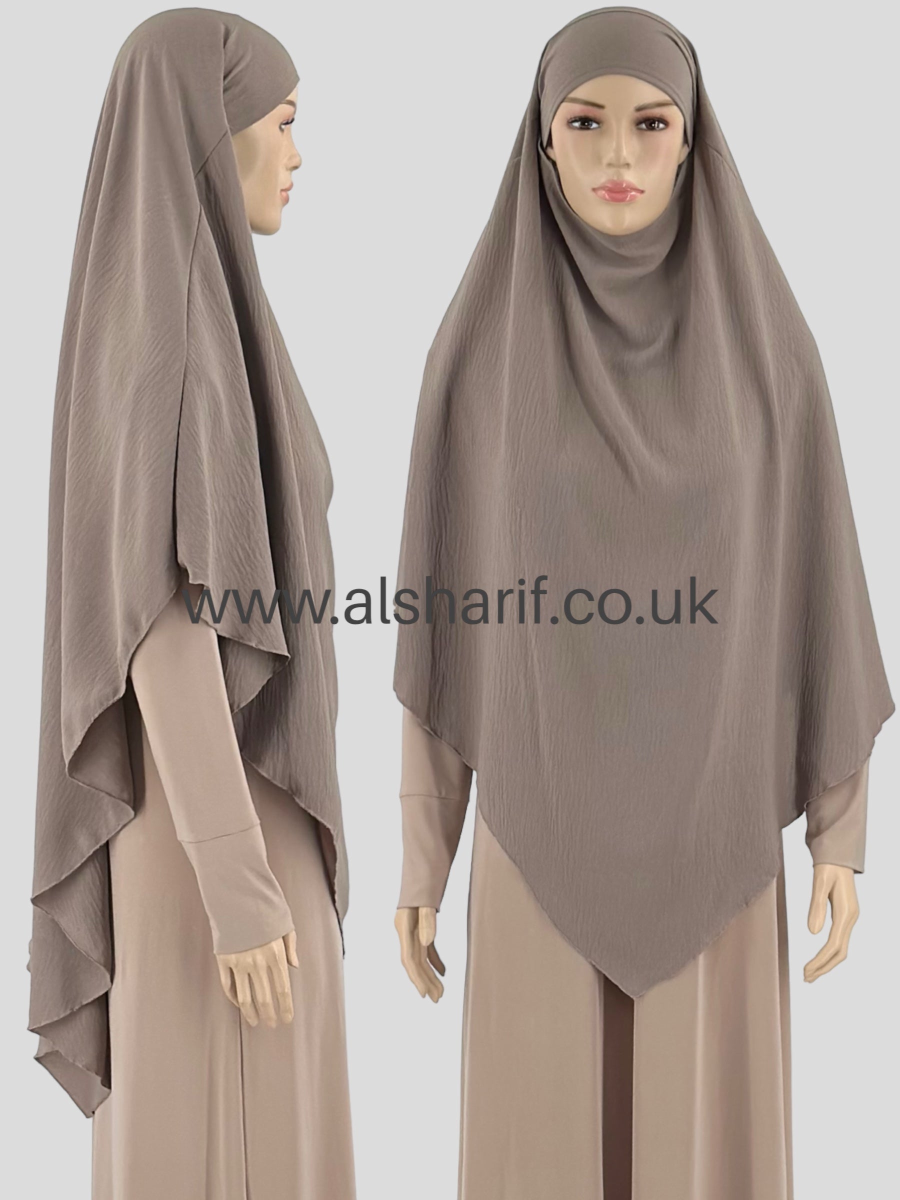 Soft Crepe khimar / hijab with tie backs that can be tied over or under the khimar. Powder touch fabric. It has a very elegant triangle shape at the front and at the back.